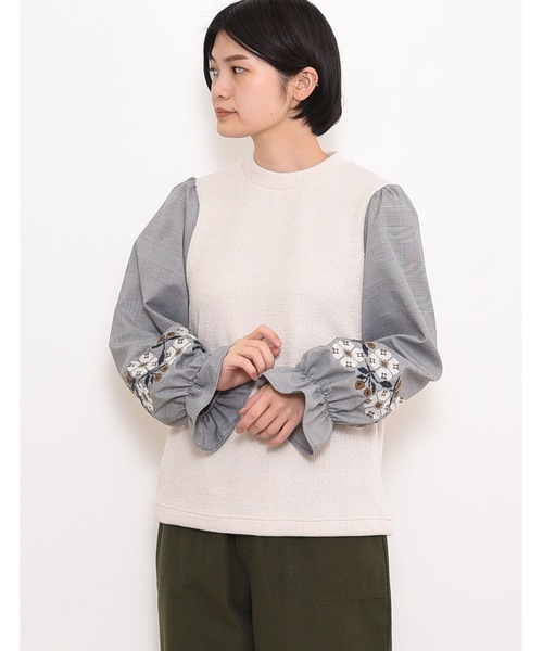 ニットソーとチェックの異素材のコンビネーションが新鮮な一枚。落ち着いた色合いのチェックに、どこか懐かしい様なほっこりするクロスステッチを施しました。コンパクトなボディに、程よいボリュームスリーブでカジュアルにもキレイめにも着ていただけます。 POU DOU DOU プードゥドゥ ひと手間加えた存在感のある「日常着」 いつまでもときめきとかわいいを忘れない方への 愛着を持てるワードローブ