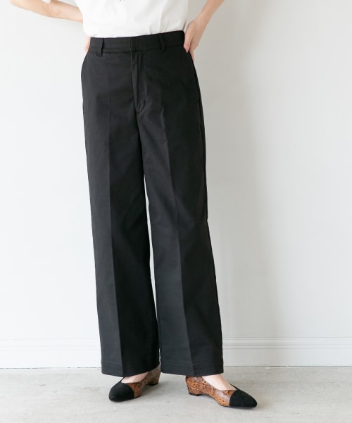 柔らかなチノの素材感が特徴的なワイドパンツ。程よいストレートワイドシルエットがカジュアルになりすぎず幅広いコーディネートに活躍。センタープレスは上品な印象で美脚効果も◎ベーシックにスニーカーと合わせたカジュアルなスタイルはもちろん、キレイめスタイルやオフィスカジュアルにも対応できる万能パンツです!