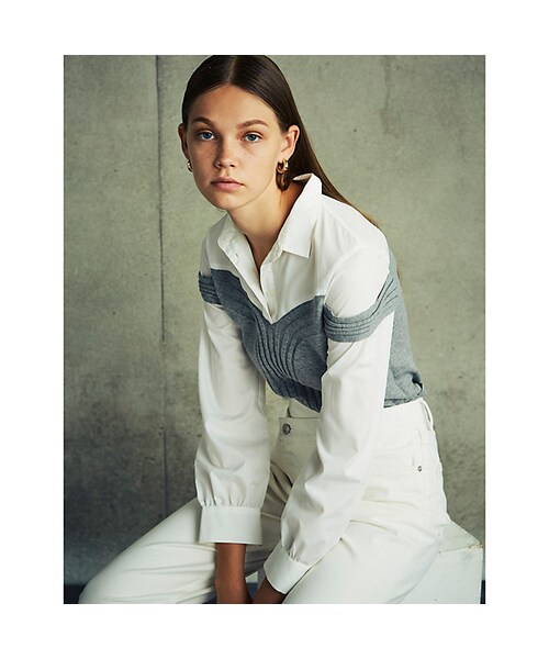 【Design/Styling】シャツの上からニットのビスチェをレイヤードしたようなデザインのプルオーバーです。シャツの衿は小さく設定しているので、OFFシーンでもカジュアルに着用頂けます。※こちら写真のものより、袖の帯ベルト状のニットが幅1.5センチ太くなっております。【Fabric】シワにもなりにくく、縮みにくい特性を持ちます。※この商品はサンプルでの撮影を行っています。実際の商品とイメージ、サイズ、品質表示、原産国等が異なる場合がございます。※店頭及び屋外での撮影画像は、光の当たり具合で色味が違って見える場合があります。商品の色味は、スタジオ撮影の画像をご参照ください。モデル(下部ディテール画像):H172 B75 W60 H83 着用サイズ:M