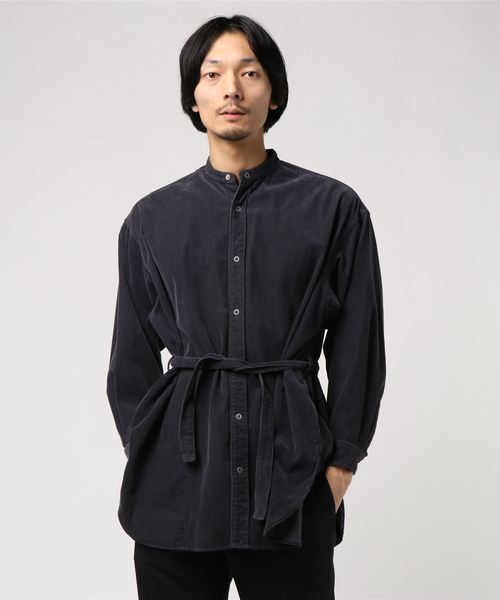 ヨーロッパのヴィンテージコートをデザインソースに作られた24 W BIG BAND COLLAR SHIRT COAT。細畝のコーデュロイ生地をしっとりと柔らかい生地に加工し硫化染めを施す事で生まれる独特なタッチと生地の表情をいかして再構築。地厚な生地は息の長いアイテムでもあり、ロングシャツのシルエットは表現の幅を広げるユーティリティ性を併せ持ちます。さらに胴回りのストラップを結ぶか垂らすか、その日のスタイリングに合わせることのできるフィーチャーで着こなしを発見する楽しさを。袖を通す回数を重ねて愛着を増す種類のアイテムです。リングスナップボタン、細かいステッチワークはKUROならではの細部に拘った一着に仕上がっています。