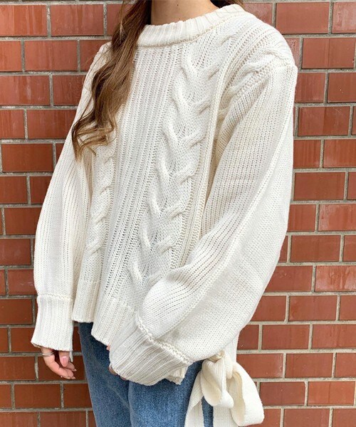 サイドのリボンがポイントになったケーブルニット。 両サイドのスリットは深すぎず、 中のインナーが見える心配もなし◎ インせずそのまま着るスタイルがおすすめです。 スカートともパンツとも相性抜群のニットです。