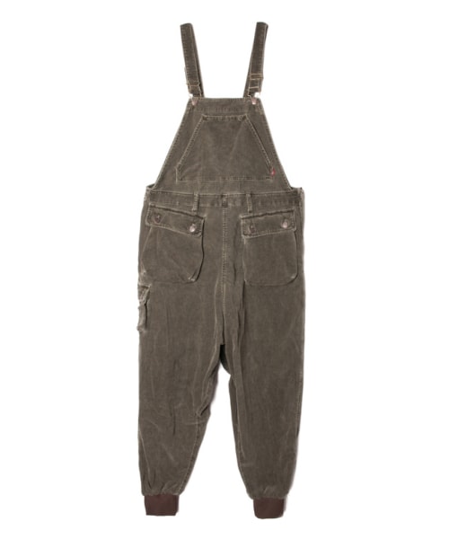 コーデュロイ仕立てのオーバーオールという生粋のワークウエアにglambが得意とする現代的なシルエットメイキングで新たな表情を吹き込んだJordi overall<ジョルディオーバーオール>。股下に大きくゆとりを取ったデザイン性溢れるサルエルシルエットに、ブランドの定番ディテールとなる裾口のリブをプラス。ラギッドスタイルのルーズな魅力を真新しいパターンワークにより惹き出しました。テキスタイルに用いたコーデュロイは本来加工の難しい素材ですが、昔ながらの硫化染料を使用した染めで生地を用意。縫製後に丹念なバイオウォッシュを施してこなれた風合いを持たせ、シルエットをより印象付けるクタリとした面持ちに仕上げました。個性の際立つ構築的なシルエットはワークスタイルを普段着ない方にもお勧め。ジャンルを超えたミックスによる1本が新しい着こなしを生み出します。