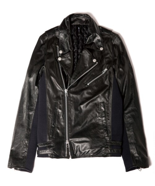 レザーメイキングに定評のあるglambが素材感に拘り抜いて作り上げたダブルライダースがRusty riders<ラスティライダース>。素材に用いられたのは上品な艶感と柔らかな質感を備えたラムレザー。縫製後に洗いをかける事で革に色の濃淡と皺を刻み、素材本来の美しさを最大限に惹き出す様仕上げています。その迫力ある風合いの反面、ボディ脇と袖下のリブ切り替えや後ろ身頃のアクションプリーツ等、機能性を高めるディテールを要所に配して伸縮性ある着心地を実現。大振りなジップや腰元のダブルベルト、裏地のキルティングなどロックなアクセントもしっかりと加えた隙の無い出来栄えとなっています。