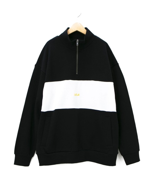 カリフォルニア大学ロサンゼルス校のハーフジップトレーナーの登場です。シンプルな切替パターン+胸にUCLAのロゴのワンポイント刺しゅうを施しております。 ゆとりあるシルエットになっておりますので、オーバーサイズ用としても着用いただけます。