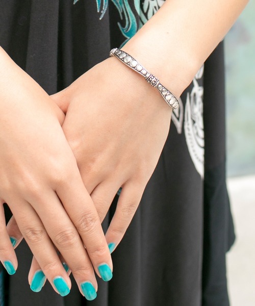 アンティーク調な風合いに仕上げた模様が、どこかエキゾチックな雰囲気を感じさせるメタルブレスレット。ゴムタイプなので簡単に着けられるのも嬉しいポイント。他のブレスレットとの重ね着けもおすすめです◎ ※こちらの商品は1点1点職人による手作りとなります。その為、形や色合いなど若干異なる場合がございます。あらかじめご了承ください。 Amina Collection Co.,LTD.