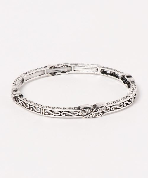 アンティーク調な風合いに仕上げた模様が、どこかエキゾチックな雰囲気を感じさせるメタルブレスレット。ゴムタイプなので簡単に着けられるのも嬉しいポイント。他のブレスレットとの重ね着けもおすすめです◎ ※こちらの商品は1点1点職人による手作りとなります。その為、形や色合いなど若干異なる場合がございます。あらかじめご了承ください。 Amina Collection Co.,LTD.