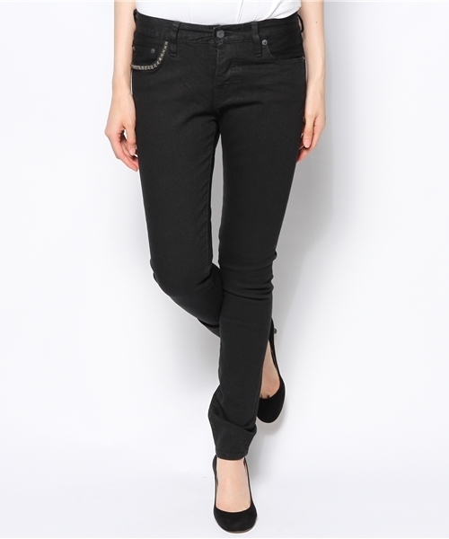 『美脚ラインを演出するストレッチデニムパンツ』 レッグラインにフィットするスリムシルエットが魅力的なデニムパンツ。 タイト目のボーイズシルエットでヒールの高さを問わずバランス良くスタイリングでき、女性らしい美しいラインが強調される逸品です。 シンプルなルックスにポケット縁にあしらったスタッズがよりシャープな印象を与え、スタイリッシュに着こなせます。 幅広いコーディネートにマッチし、こなれ感漂う着こなしをアシストする、ワードローブの定番アイテムになる一本です。 modelH170 B81 W65 H88 着用サイズ:MEDIUM