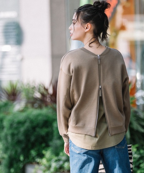 □2020 SPRING&SUMMER COLLECTION□ ◆使える前後2WAYがうれしい!何かと使えるTOPS兼ブルゾンというとってもおいしいアイテム◆ <MATERIAL> 表側は極細のリブ編みで裏側はフラットな天竺編みのダブルフェイス組織のスウェットライクなジャージ素材です。 タンブラー加工に寄って柔らかな風合いが出ています。ダブルフェイス素材なので、程よい生地の厚さもあります。 スウェットよりもキレイめでダレ感も少なく、上品な仕上がりのジャージ素材で、今までになかった新開発素材です。 サラリとした肌触りはロングシーズン着まわせる大人カジュアルな最旬素材になっています。 カラバリは、ややスモーキーなニュアンスカラーを明るめトーンで統一させています。 <DESIGN> 柔らかな素材とカットソーならではの魅力を活かし、着心地抜群なカジュアルブルゾン兼プルオーバーをつくりました。 裾から袖口までの切り替えポイントや、ステッチ使い、プルオーバーとしてもブルゾンとしても両立できるサイズ感、 着用の際のアレンジのしやすさなど、細かな計算によってシンプルながらも女性らしく、着心地もストレスなく着れるデザインに仕上げました。 ファスナーは逆開ファスナーを採用してスリットのように開けて着ることが出来ます。 シルエットも、立体感があり女性らしい丸みのあるシルエットに仕上げています。 <COLOR> ■ブラック:パキっと色がしっかりとのったブラックカラーです。キレイめな着こなしも、カジュアルな着こなしも、どちらでも非常に相性のよい使い勝手の良いカラーです。 ■ライトベージュ:赤みを抑えた優しい印象のカラー。膨張感は全くなく、顔移りも良いカラーなので爽やかなな印象のカラーです。 ■カーキ:モカっぽい印象のライトブラウンよりのカーキカラー。今シーズンも活躍しそうなスモーキーなニュアンスカラーです。 ■ライトグリーン:ややカーキのようなシックな印象のライトグリーンカラー。大人なカジュアルな着こなしにぴったりなカラーです。 *お取扱いについては、商品についております品質表示にてご確認ください。 洗濯:洗濯機使用可 ............................≪INFORMATION ≫............................ ▼商品のお気に入り登録▼ 『♡』マークを押してお気に入り登録して頂いた商品は、セール開催の通知やクーポン発行などの キャンペーンなど、お得な情報をいち早く受けとる事が出来ますので、ぜひご登録ください。