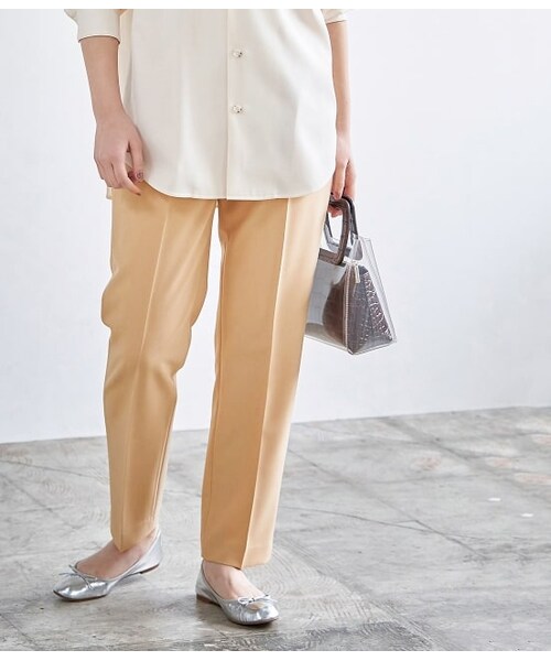 ポリエステルでしわになりにくい素材を使用したスラックス。ストレッチ性があり、快適な履き心地が特徴です。ウエストにはアジャスト機能が付いており、お好みで調整が可能。前ポケットの生地を繋げることでフロント部分のタックが開かず、すっきりとした着こなしを叶えるなど細部にまでこだわり抜いたアイテムです。安心感のある深めの股上に、裾に向けてタイトなシルエットに仕上げて美脚効果も抜群。お仕事着や普段使いにまで幅広いシーンに着こなせる万能な1本です。※画像の商品はサンプルです。お届けする商品に仕様・サイズ等の変更