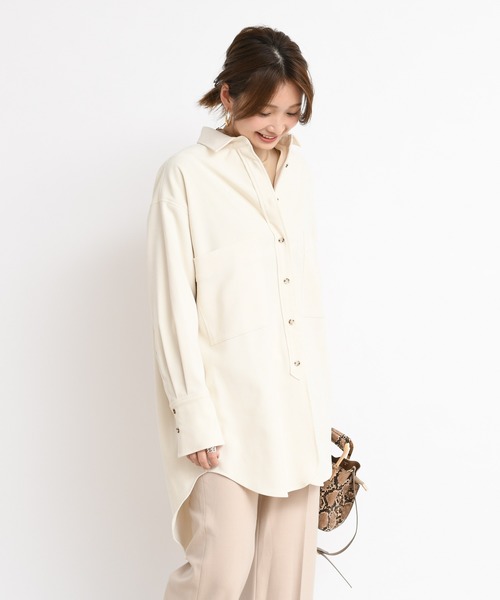 こなれたコーディネートに仕上げてくれるロングシャツ。バックの丈感を長くすることで縦ラインを強調し、スッキリとしたシルエットを叶えます。淡い色合いが女性らしさを演出しつつ、大人っぽい印象に。細身のパンツと組み合わせればバランス良く決まります。