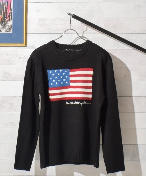 【POPなUSフラッグデザイン!】アクリル素材でインナー、アウター次第でロングシーズン使えます! トレンドのダッドスタイルにもはまるUSフラッグデザイン! ゆったりしたシルエットで男性女性共に使え、 キャッチーなデザインはペアやリンクコーデに最適なアイテムです!