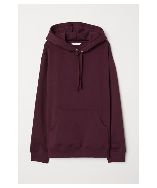 ゆったりしたスウェットパーカ。フードは裏地付きで、ドローストリング入り。カンガルーポケット付き。袖口と裾にリブ付き。