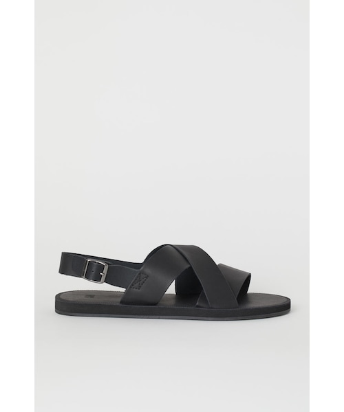 フェイクレザーのサンダル。フロントにクロスストラップが付いたスタイル。金属のバックルと隠しゴムが付いた、長さ調節可能なバックストラップ付き。裏面に溝が入ったラバーソール。