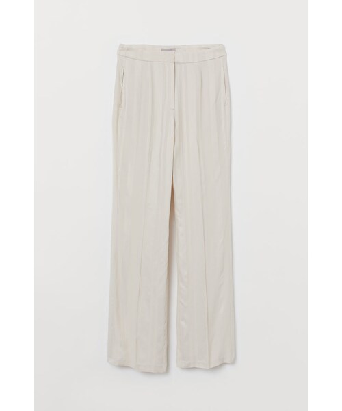 ビスコース織物素材のパンツ。ジャカード織りのストライプ柄。レギュラーウエストで、かぎホック留めの持ち出し付き。ジップフライ。ワイドなストレートレッグ。
