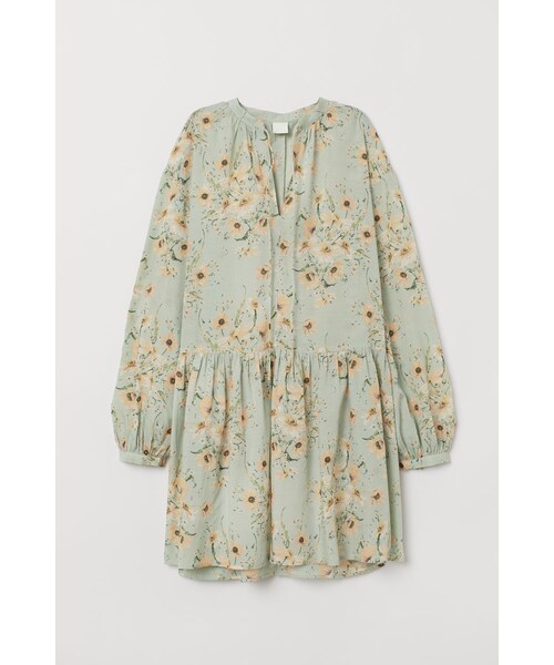 エアリーな織物素材のワイドワンピース。低い襟付き。胸元に開きがあり、首元に結べるコードが付いています。袖口周りにプリーツを入れた長袖バルーンスリーブ。袖口にボタン付き。腰回りに切り替えがあり、スカート部分はギャザーを寄せたフレアスタイル。裏地なし。