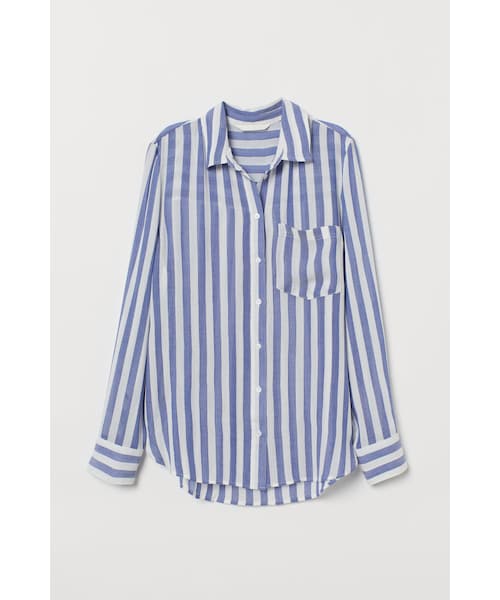 シワ加工を施したビスコース織物素材の長袖シャツ。襟付きで、フロントボタン。片胸ポケット付き。バックはヨーク付きで、プリーツ入り。ボタンで袖口周りを調節できます。裾はラウンドカット。バックのほうが少し長めになったスタイル。
