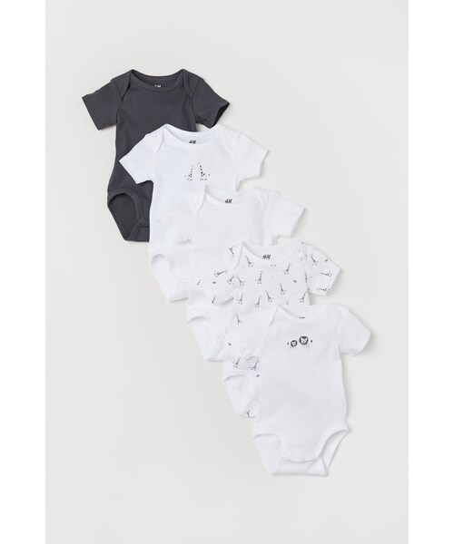 オーガニックコットンを使用した、ソフトなジャージー素材の半袖ボディスーツ。ラップショルダー。股の部分にスナップボタン付き。