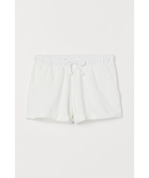 軽量スウェット素材のミニショートパンツ。ドローストリング入りのゴムウエスト。サイドポケット付き。裾の折り返しが縫い付けられています。