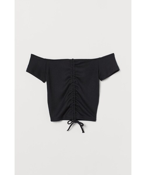 リブジャージー素材のオフショルダートップス。ボディにフィットするクロップドスタイル。フロントにドローストリングが施されています。半袖。