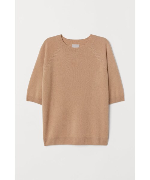 ソフトなカシミヤのファインニットセーター。ショートスリーブ。ネックライン、袖口、裾はリブ編み。