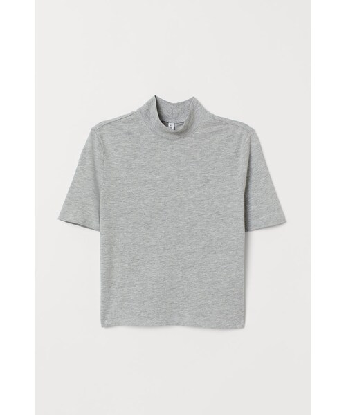ハイネックのショートトップス。ボディにフィットするスタイル。ソフトなジャージー素材。