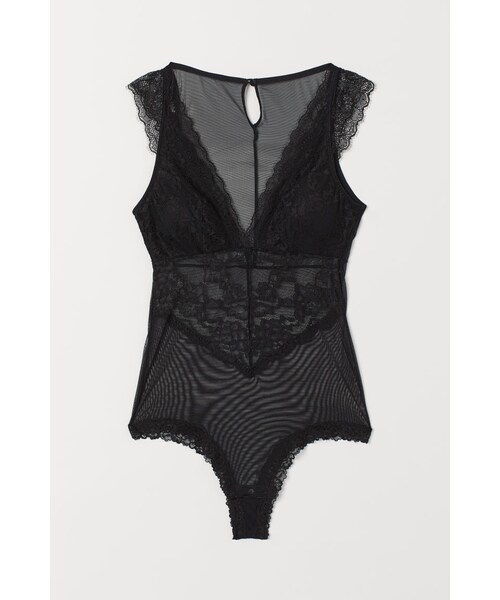レースとメッシュ素材を使用した、ソフトなボディスーツ。レースのキャップスリーブ。パッドが入ったカップ付きで、バストの形を整え、ほどよくサポートします。取り外しできるパッド入り。バックに開きがあり、くるみボタンが1つ付いています。バックがハイカットになったスタイル。クロッチ部分はスナップボタン留めで、裏地付き。