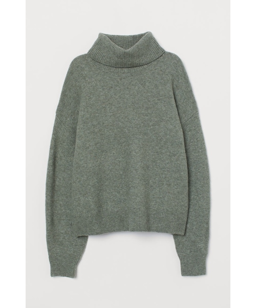 ボクシーなスタイルのタートルネックセーター。ウールを含むソフトなニット。ドロップショルダーで、長袖。袖口と裾はリブ編み。