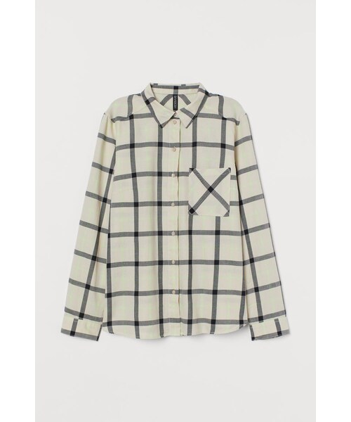 コットン織物素材の長袖シャツ。襟付きで、フロントボタン。バックはヨーク付きで、プリーツ入り。ボタン留めのカフス付き。