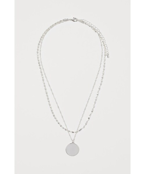 2連のショートネックレス。メタルのツイストチェーンを使用。1本のチェーンに円形のペンダントトップが付いています。長さ調節可能 43~52cm。