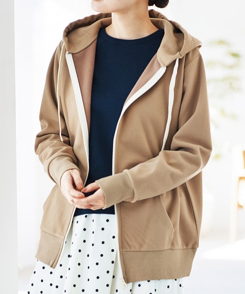 ギュッと目の詰まった生地にしっかりと起毛をほどこしてスエードのような風合いに仕上げたカットソーを使い、ジップアップのパーカーを作りました。ほどよくゆとりを持たせたサイズ感は、ふだん遣いにぴったりのらくな着心地です。 ファスナーやフードひもをアイボリーにしてアクセントにしました。