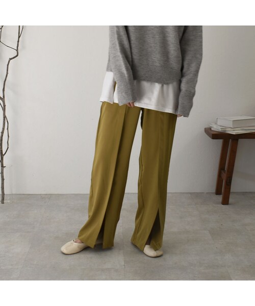 履くだけでこなれた印象にしてくれるニュアンスカラーのパンツ。 センターに入ったスリットがフレアなシルエットで脚を綺麗に見せてくれます。ベージュ系カラーや、グレーなど合わせやすい色味で普段カラーパンツを穿かない方も挑戦しやすいカラーです。 今の時期にはニットと、春先にはロングシャツなどと合わせても◎ (モデル身長166cm/Mサイズ着用) ※サイドポケットあり。バックポケットはフェイクになります。 ■素材 ポリエステル100% ※裏地なし ■サイズ【M/L】 ウエスト 66 / 70 ヒップ 88 / 96 股上 32 / 32 股下 71 / 71 わたり 30 / 32 裾幅 22 / 23 こちらは、クロネコ宅急便で発送商品になりますので、お届けまでに発送から1~2日かかります。