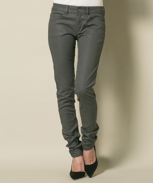 特殊な樹脂加工を施した、微光沢感が美しいコットンデニム。コーティングされた表面感がカジュアルな5ポケットのスキニーパンツに上質さをプラスしています。何にでも合わせやすい、ベーシックな形です。