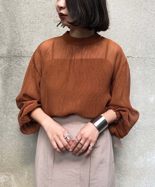 軽やかに華やぐボリューム袖の楊柳ブラウス ハイネックの楊柳ブラウスは1枚でサラッと着られるアイテム。リラックス感もあり程よい抜け感を演出してくれます。 シアー素材なのでインナー次第で雰囲気の変化を付けられます。 (同系色のインナーキャミソール付き)