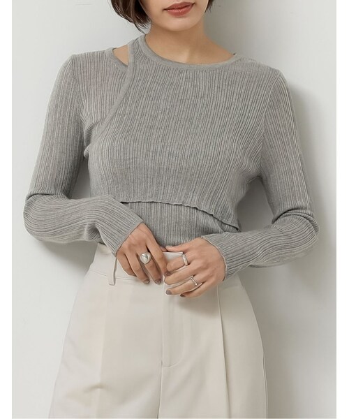 【デザイン】同色のニットをレイヤードしたようなデザインのトップスが登場。一枚で簡単にこなれたレイヤードスタイルが完成します。アシンメトリーのルックスと肩開きデザインがコーディネートに新鮮さを加えます。素材・着用感柔らかな手触りのリブニット※シルエットをくずさないために、保管の際はハンガーを使用せず、たたみ保管にして下さい。※この商品は、素材や縫製の特性上、一点一点多少大きさが異なります。 ※開封後、素材の性質上、染料のにおいが多少強く感じられる場合がございます。気になる場合は、数日のご使用や陰干しなどでにおいはほとんど感じられなくなりますのでお試しくださいますようお願いします。
