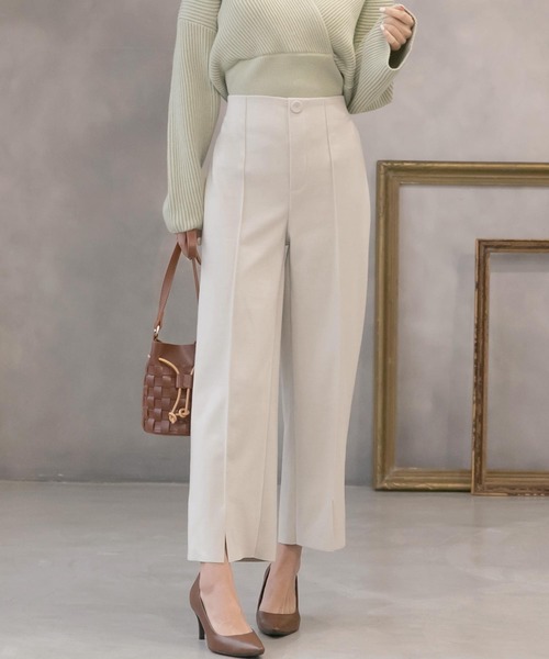 フェイクウールであったか+センタースリットでトレンディな大人の高見えストレートワイドパンツが新登場。トレンドのブーツをインしたレイヤードから、パンプス合わせにぴったり。ピンタック仕様で美脚効果もプラスしました。【素材・サイズ感】柔らかく起毛感のあるフェイクウール素材を使用。ポケットが無い分、ヒップやお腹周りのシルエットが綺麗に決まります。様々なシューズをレイヤードしやすいアンクル丈、バックゴムなので着脱もしやすい1枚〇ウエストの飾りボタンもポイント。 ウエストゴム有りです。
