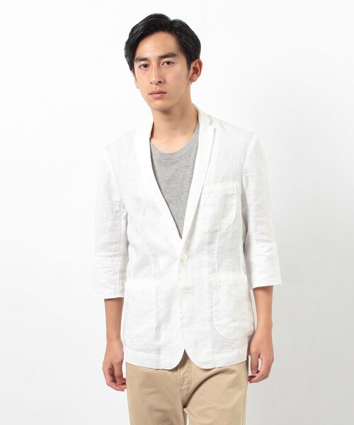 麻素材で仕上げたシンプルなジャケット。夏にも着れるジャケットで、ショートパンツとのコーディネートに相性抜群。