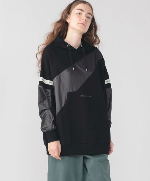ロゴのテープがデザインアクセントになっているビッグシルエットのパーカースウェット。スポーツテイストの別布ドッキングと、ロゴテープの切替えで、レトロな80年代テイストを現代風にアレンジ。 コットンの裏毛と、スポーツ風生地を使用しているので取扱いも楽チン。ボトムにレギパンなどを合わせてかっこよくリラックススタイルでの着こなしなどオススメです。 明るいオートミールとブラックの2色展開。 2色共ロゴテープは、生成りにワインカラーロゴのものを使用しています。