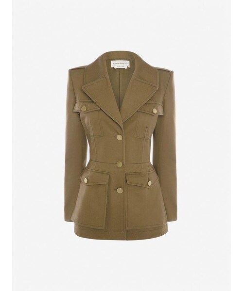 Khaki green military-inspired jacket in cotton twill featuring contrast topstitching and pleated kickback detail. The jacket is detailed with epaulettes on the shoulders and large front pockets, finished with gold plated button fastenings. Material 100% Cotton Product code 605296QFAAD3360 The model is a standard IT 38 Model measurements Height: 180 cm - 5' 11" Bust: 83 cm - 32" Waist: 57 cm - 22" Hips: 88 cm - 35" Shoe Size: 39 - 6