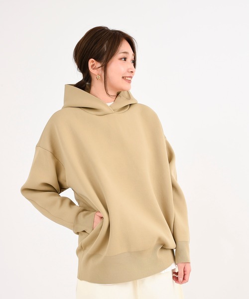 ワイドシルエットでトレンド感を出した、ニットパーカー。ドルマンスリーブを採用した抜け感のあるデザインで、シンプルに着てもニュアンスのある着こなしに。スエットではなく、ニットなので、カジュアルすぎず、女性らしく着ていただけます。装飾のないベーシックでクリーンなデザインが◎大人カジュアルの定番として着回ししていただけます。