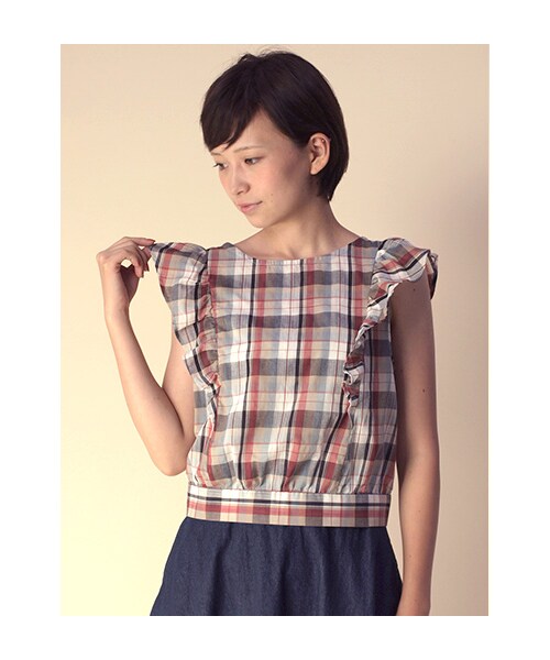 マドラスチェック柄が可愛いトップス。肩フリル切替デザインなので顔周りも立体感があり◎。※後ろボタン開きです。