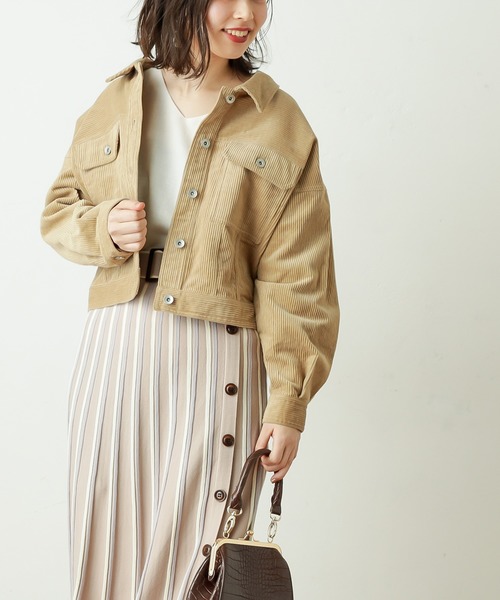 【2020SS natural couture】 羽織るだけで大人の春のカジュアルスタイルに!コール天ジャケット 柔らかな風合いのコール天素材のブルゾン。まだまだ寒いこの時期にぴったりな1枚です。腰がカバーできるぐらいのコンパクトな丈感は、ワンピースやスカート、パンツなど様々なアイテムと相性抜群。ゆとりのあるサイズ感なのでインナーも選びません。春らしいカラーが軽やかな印象に仕上げてくれますよ。また、後に少し抜いて着ると、こなれ感もプラスされた着こなしに◎どんなボトムスにも合わせやすいショート丈で、これからの季節に活躍すること間違いなしのジャケットです!