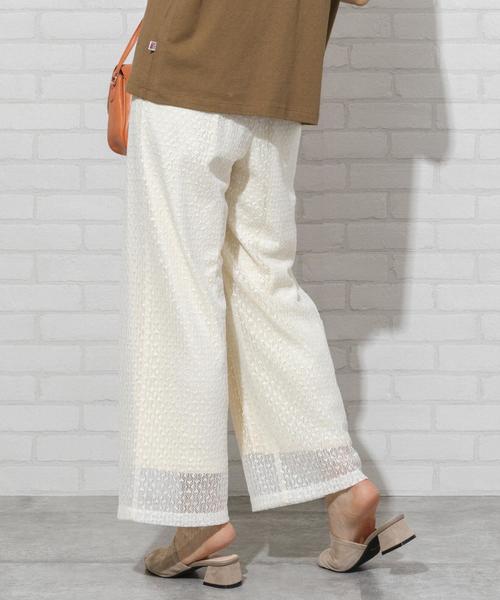 ~2020 SPRING/SUMMER COLLECTION~カジュアルスタイルに取り入れたいレースパンツ贅沢な総レースのワイドパンツ。カジュアルスタイルにほんのりフェミニンな印象を与えるアイテム。ウエストはゴム仕様なので、履き心地は楽チン。太目のレングスでも、すっきりとした見た目なので、どんなトップスにもコーディネイトし易くなっています。レギンス感覚でワンピース合わせも◎。裏地がついているので、透け感を気にすることなく着用いただけます。【スタッフ着用コメント】<<札幌エスタ店・かとうさん>>身長:170cm 女性 普段着用サイズ:L 試着サイズ:Lウエストが総ゴムで履きやすいです。花柄などのレースほど甘くなりすぎない、ひし形レースなので大人っぽく着こなせます。長さは少し短く、レース部分がくるぶし位、裏地は4センチくらい短いですが、肌が透ける感じもかわいく、夏にはサンダルで着こなしたいと思います。ポケットはなく、着丈の長いトップスや、ワンピースとの合わせがおすすめです。ホワイトのカラーは裏地はありますが、濃い色の下着は避けたほうがよさそうです。<<池袋店・あらきーさん>>身長:163cm 女性 普段着用サイズ:L 試着サイズ:Lワンピースに合わせようと思い、購入しました。裾に透け感があるのでワンピースから少し覗かせるだけでも、涼しげな印象になりました◎ 着用感は見ても伝わる通りとても軽く、ノンストレスでお召しいただけます。ウエストは総ゴムで、ギャザーが甘さをプラスしてくれるのでシンプルにTシャツ等を合わせるのもオススメです。<<池袋店・ユカさん>>身長:148cm 女性 普段着用サイズ:S 試着サイズ:Mしっかりとしたレース素材のワイドパンツです。幅はゆったりですが縦のラインが綺麗に出るので、体型をカバーしてシルエットをすっきり見せてくれます。裾の足首にかかる部分はレースのみの仕様となっており、レースが透けて程よく肌見せできます。着丈は148cmでMサイズを着用し、裾が足の甲にかかる長さです。ウエストはゴムなので楽に履いていただけます。調節できる紐も付いているので安心です。ロング丈のワンピースやシャツとのレイヤードがおすすめです。<<仙台パルコ2店・のださん>> 身長:153cm 女性 普段着用サイズ:S 試着サイズ:M ウエストがゴムなのでゆったり履けます。レースが特徴的なので長めのTシャツやワンピースと合わせるだけでトレンド感のある着こなしになります。丈も長すぎず足の甲が見える長さなのでサンダルやミュールに合わせて履きたいです。レースが繊細で引っ掛けやすいので、マジックテープのスポーツサンダルと合わせるのはあまりお勧めしません。Vカットミュールやパンプスだとフェミニンさが増して可愛いです!【注意点】※撮影商品はサンプルの為、実際の仕様と異なる場合がございます。※画像の商品は光の照射や角度、お使いのモニター環境により、実物と色味が異なる場合がございます。スタジオ物撮りの画像が実物の色味に一番近くなっております。※予約商品の場合、実店舗への入荷は「お届け予定」とほぼ同時期となりますが、実店舗への入荷が前後する場合もございます。品名:FC レース PT品番:76406020019