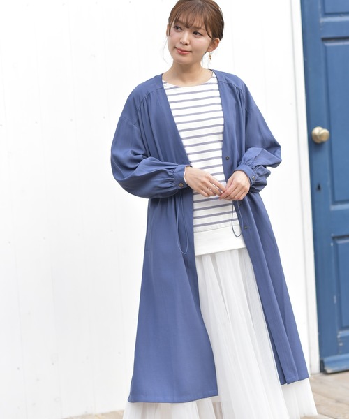 さらっとはおるだけで決まるガウンコート シンプルなノーカラーが使いやすいスプリングコート。 薄手で裏地がなく季節の変わり目にピッタリなアウターです。 しっとりとした手触りのレーヨンミックス素材が作るしなやかな落ち感が魅力。 ウエストに入れたゴムひもでシルエットの変化も楽しめます。 袖口のギャザーでふっくらとボリュームをつけて女性らしい印象に。 フロントも袖口も着脱しやすいスナップボタンを使用。 前立ては比翼仕立てですっきり上品に仕上げました♪ 裏地なし 伸縮性なし 薄手 前開きボタン留め 袖口ボタンあり サイドポケットあり ウエストゴムひも入り(調節可) 洗濯:手洗い可