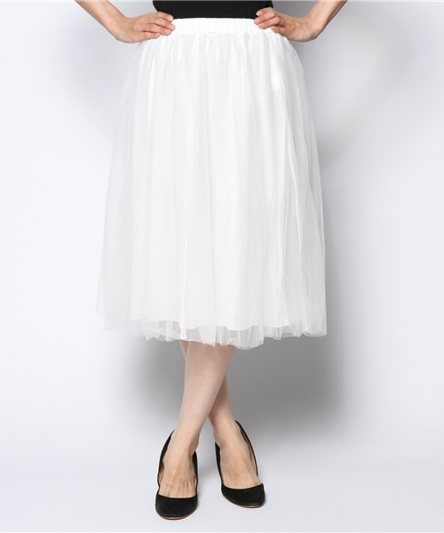 動きに合わせてチュールがふんわりと揺らめくフェミニンなムード満点のスカート。ウエスト部分にはたっぷりのギャザーをあしらい、ふんわりとしたシルエットを演出しました。短すぎないミディアムな着丈も、品格ガーリーに仕上がるポイントに☆ ワンカラーのシンプルなデザインで着回しが効くのも魅力的。ミリタリージャケットなど、あえて辛口なトップスを合わせて、ビター&スイートな雰囲気で着こなしてもGOOD☆ modelH160 B82 W62 H87 着用サイズ:2