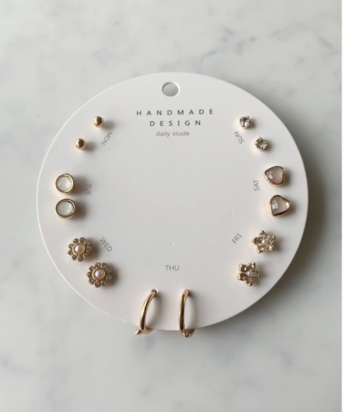 『 ミニ ストーン セットピアス 「Mon~Sun」 』 毎日違うデザインのアクセサリーを身につけたい方に嬉しい曜日ごとに分けられたセットピアス。 パールやハート、フラワーなどの女性らしいモチーフ、ベーシックなフープピアスを組み合わせました◎ ピアスホールが複数開いている方はお好きなデザイン同士で着けたり、お手持ちのピアスとの合わせたり、、、 デイリーからオフィスカジュアル、入卒園・入卒業式などのフォーマルな装いに合わせていただける優秀アイテムです♡ ※台紙に変更がある場合がございます。 ※撮影・モニター環境等により実際の商品の色味と異なって見える場合がございます。 ※台紙はピアスの保管としてもお使いいただけるのでぜひご活用ください。 〈商品のお気に入り登録〉 お気に入りの登録をして頂きますと セールの通知・ラスト1点になった時の通知や、再入荷通知を受けることができます♡ 〈ブランドのお気に入り登録〉 新商品の発売や再入荷、タイムセールやクーポン発行のお知らせなど お得な情報を受け取ることができます。