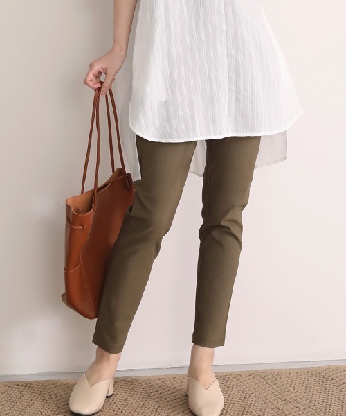◆Bou Jeloud(ブージュルード)◆ 累計売上枚数110万本突破!!!!BouJeloud永遠の名作ストレッチパンツが素材を新たに入荷しました!! 驚きの履き心地を実現、リピート確実の自信作♪ ふっくらと柔らかい風合いに生地をしあげ、より肌のフィット感の滑らかさを追求。 【デザイン】 ウエストはゴムが内側に入ったインゴム仕様。後ろ部分にだけギャザーを入れることで前から見た目をスッキリとブラウスやトップスをフロントインする時にも綺麗なシルエットをキープ。フロントにデザインされたタックがポイント!ウエストよりちょっと下にタックを入れる事でウエスト部分のタックのゴワつきを無くしてヒップラインを綺麗に見せ、もも部分にゆとりを出して運動性も向上。裾に向かってスリムなシルエットも新素材のストレッチ生地で履き心地◎ 《スタイリング》 綺麗目なコーデもカジュアルコーデもどちらでも合わせられるのが人気の理由!レギンス変わりにチュニック合わせでも使えます。トレンドのルーズなシルエットのトップス合わせもボトムのスッキリとした印象がマッチ◎アーバンライク(都会的)な見た目に。 スッキリ細めのシルエットはロングカーデや丈の長いトップス、羽織、コートともバランス良く合わせやすいので使える幅もグッと広がります。 生地の厚さ:★★★☆☆ (程良い厚み、シーズンレス) 伸縮性:★★★★☆ (PU 3%) 透け感:★★☆☆☆ (白系の色のみ下着の色によって若干透ける場合がございます) 裏地:なし ポケット:あり 洗濯表示 ※お取り扱いに関して 手洗い推奨 裏返しにしてさかさに干すとしわも伸びてノーアイロンでOK。それでもしわの気になる方は当て布を使用し短い時間でのアイロン掛けをお勧めいたします。 *乾燥機の使用はお避け下さい。
