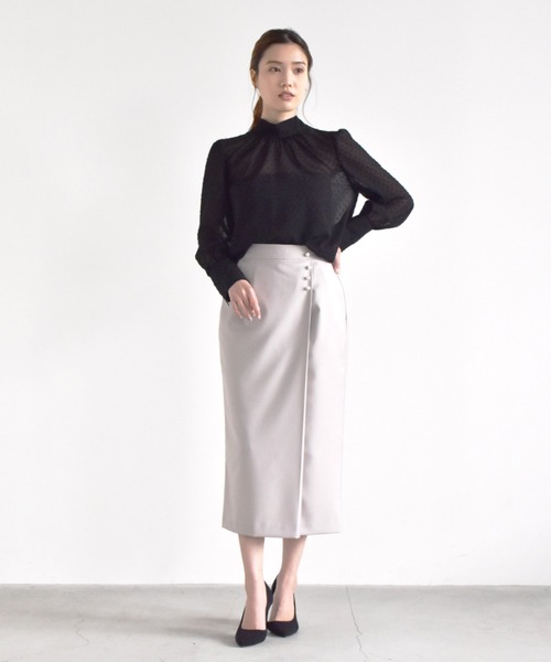 深めのタックの上にパールボタンをあしらったタックスカート。 長めの着丈とコクーンがかったシルエットでトレンド要素を取り入れました。 レーヨン混のポリエステル素材は肌触りが良くしなやかな着心地で、同素材のブラウスと合わせることで入学式・卒業式などのフォーマルシーンはもちろん、通勤やオフィスシーンにもお使いいただけます。 ◇カラー 肌映りのいいグレージュ ◇備考 後ろウエストゴム ◇セットアップ対応 パールピン付きブラウス(店舗品番:010408)