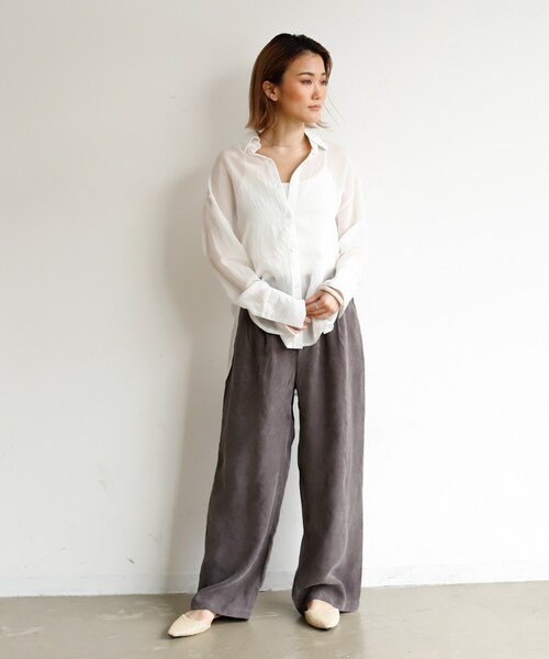◆シーズンレスに使える!キュプラルーズパンツ 【特徴】 キュプラ素材特有の程よい光沢感のあるルーズパンツ。 フロントにはタックデザインを施し、インスタイルでも かっこよく決まる大人な雰囲気に。 ゆるっとシルエットながらもドレープ感があり、 ON/OFF問わず様々なシーンに大活躍間違いなし◎ シーズンレスにお使い頂ける万能ボトムです。 【スタイリングポイント】 ルーズシルエットなので、少しタイトなトップスを合わせると 更にパンツのラインも引き立ちマニッシュスタイルに◎ カジュアルなスウェットやロゴトップスと合わせてもおすすめ♪