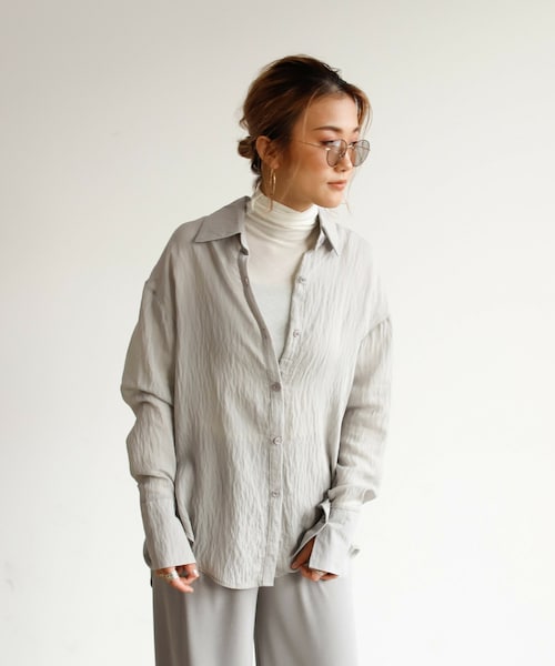 ◆程よい光沢感が特徴のルーズシャツ 【特徴】 トレンドの透け感のある素材を使用したルーズシャツが登場。 程よい光沢感のあるサテン調生地で定番シャツももこなれた印象にアップデート◎ さらっとした薄手の生地感なので真夏には冷房対策や日よけ対策としても 大活躍間違い無しの万能ロングシャツです♪