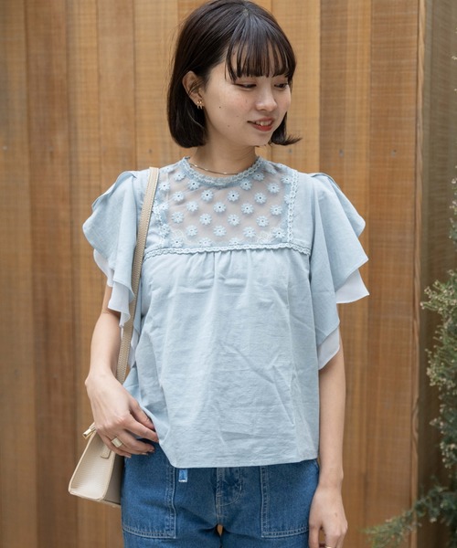 透明感溢れるデザインフルなレースミックスブラウス。華やかなディティールをふんだんに散りばめたflowerらしい花柄デザインブラウス。胸元のお花モチーフレースは透明感と女性的な雰囲気を演出してくれます。カシュクールになった花びらのようなフレア袖は華やかさだけでなく二の腕をすっきり綺麗にみせてくれる効果も◎デザインフルなアイテムなので合わせるボトムスはカジュアルなデニムや柔らかいカラーのものがおすすめです。※サイズ詳細は平置き時の採寸のため、目安となっております。予めご了承ください。